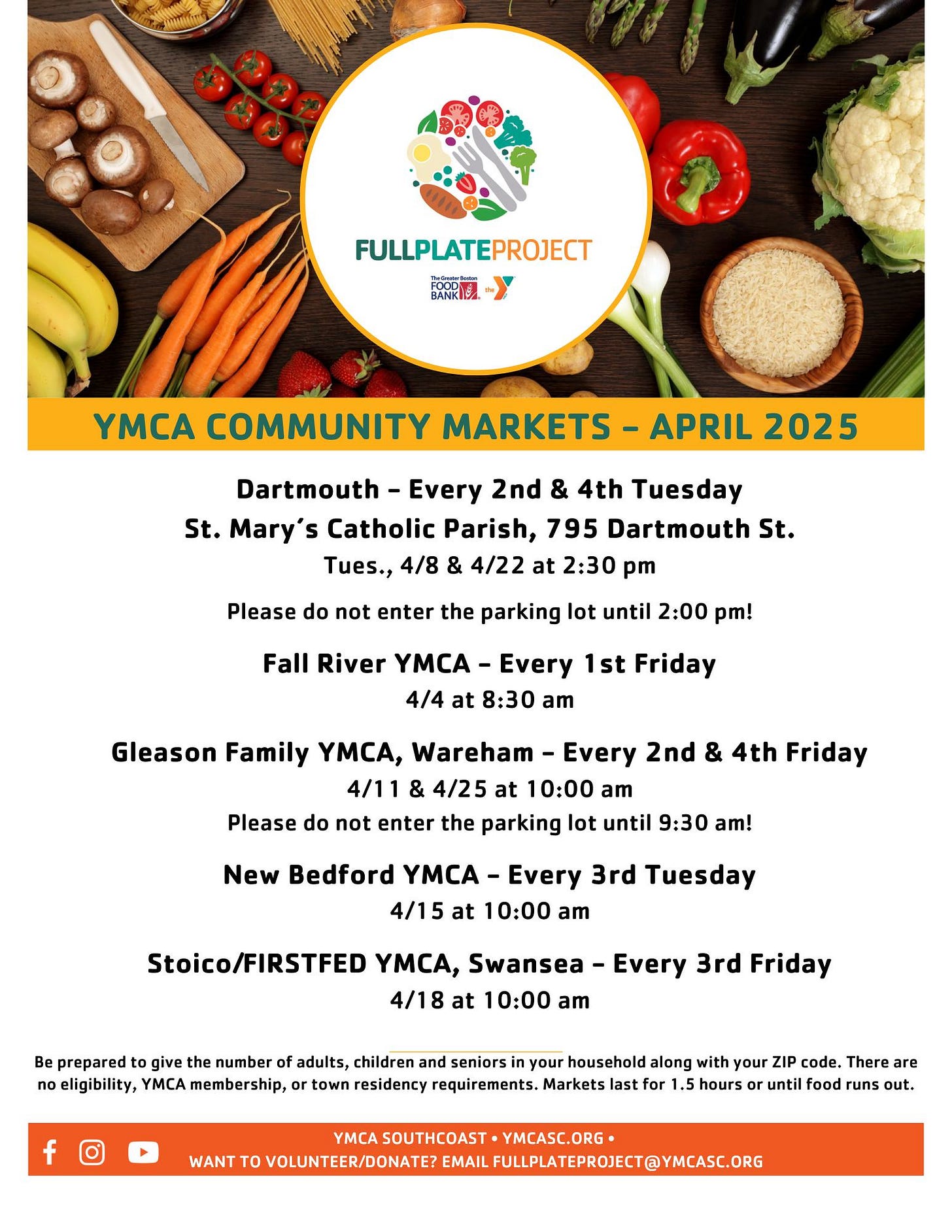The Full Plate Project has revealed the YMCA Southcoast's Full Plate mobile market schedule for April 2025. These mobile markets, hosted at local YMCAs, are open to anyone in need and offer each household items such as prepackaged fresh, frozen, and pantry food items (while supplies last). There are no eligibility, town residency, or Y membership requirements, and it is open to all who are in need.