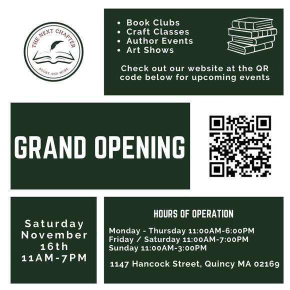 The Next Chapter Books and More's grand opening celebration will include author signings, a "blind date with a book" raffle, a step and repeat photo opportunity, face- painter, and more, making it the perfect event for book lovers in the area looking to meet new people and find their next favorite book! Book lovers in the area are encouraged to mark their calendars and join in the celebration on Saturday, November 16th from 11 am until 7 pm, as this new chapter in Quincy's literary scene unfolds.