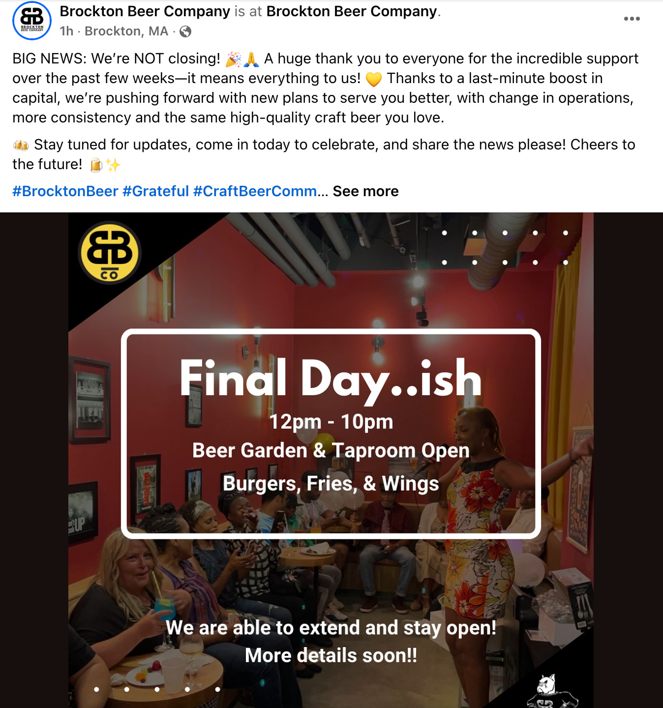 Brockton Beer Company expressed its gratitude to the community for their overwhelming support, stating, "A huge thank you to everyone for the incredible support over the past few weeks—it means everything to us!" They then told their community to stay tuned for future updates and invited everyone to come in to celebrate. The announcement ended on a positive note: "Cheers to the future!"
